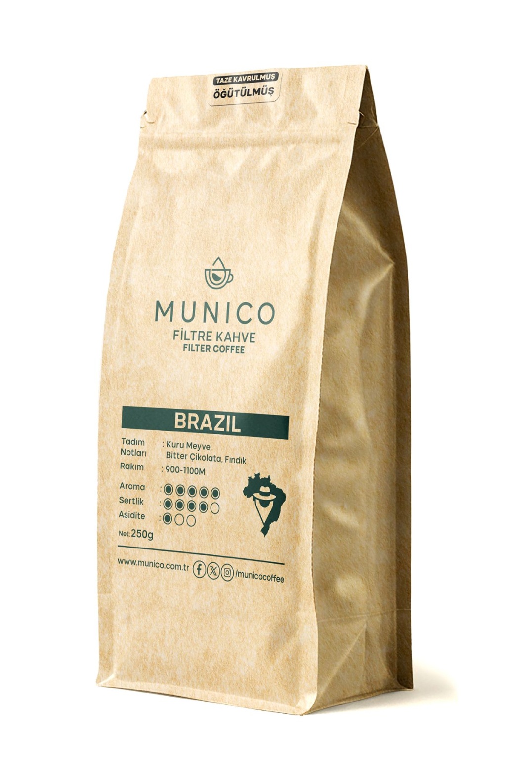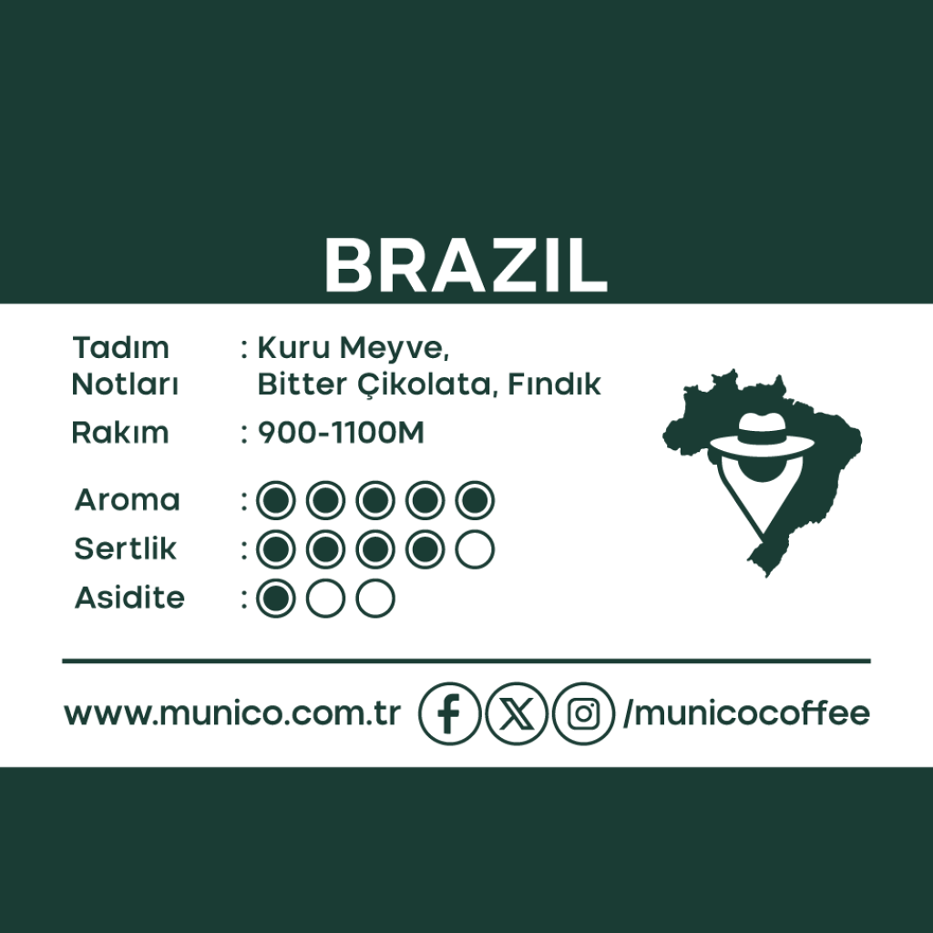 Munico Brezilya Öğütülmüş Filtre Kahve, bitter çikolata, fındık ve kuru meyve aromalarıyla dolgun gövdeli, düşük asiditeli ve yumuşak içimli premium bir Brezilya kahvesidir. Her demleme yöntemine uygun klasik filtre kahve.