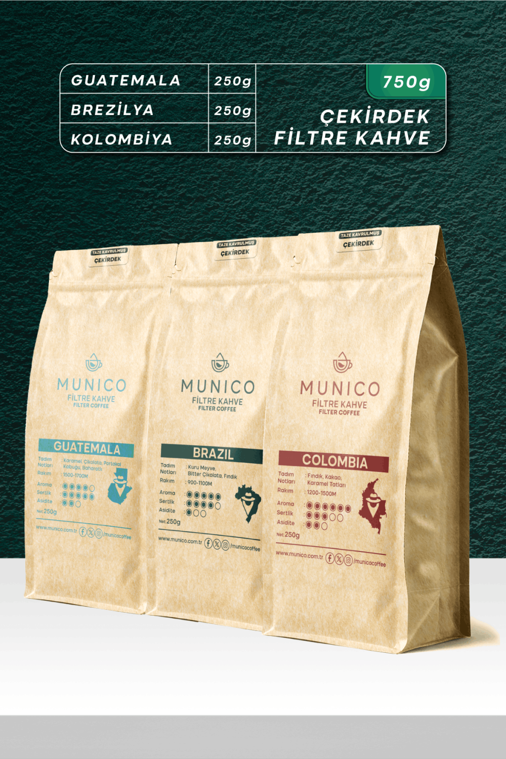 Munico Guatemala-Brezilya-Kolombiya Çekirdek Kahve Tadım Paketi 3X250gr (750gr)