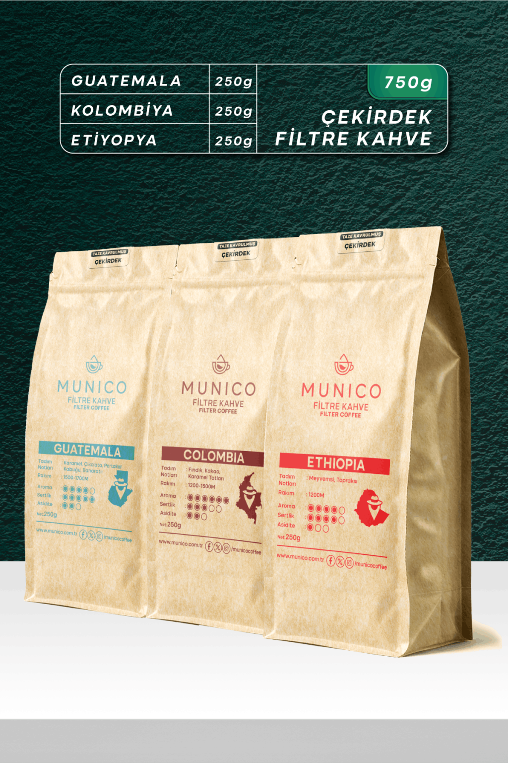 Munico Guatemala-Kolombiya-Etiyopya Çekirdek Kahve Tadım Paketi 3X250gr (750gr)