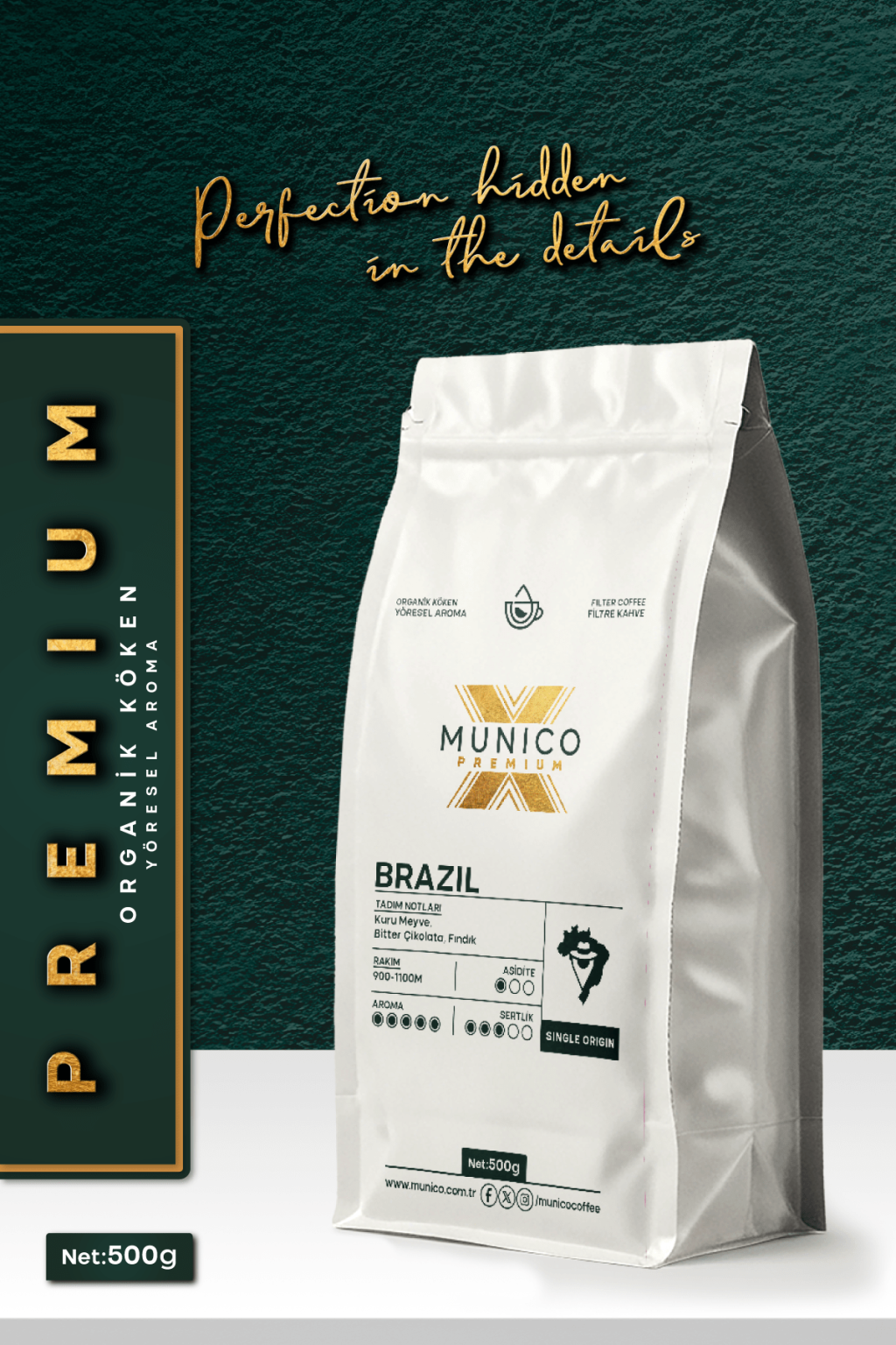 Munico X Premimum Brezilya Çekirdek Filtre Kahve, bitter çikolata, fındık ve kuru meyve aromalarıyla dolgun gövdeli, düşük asiditeli ve yumuşak içimli premium bir Brezilya kahvesidir. Her demleme yöntemine uygun klasik filtre kahve.