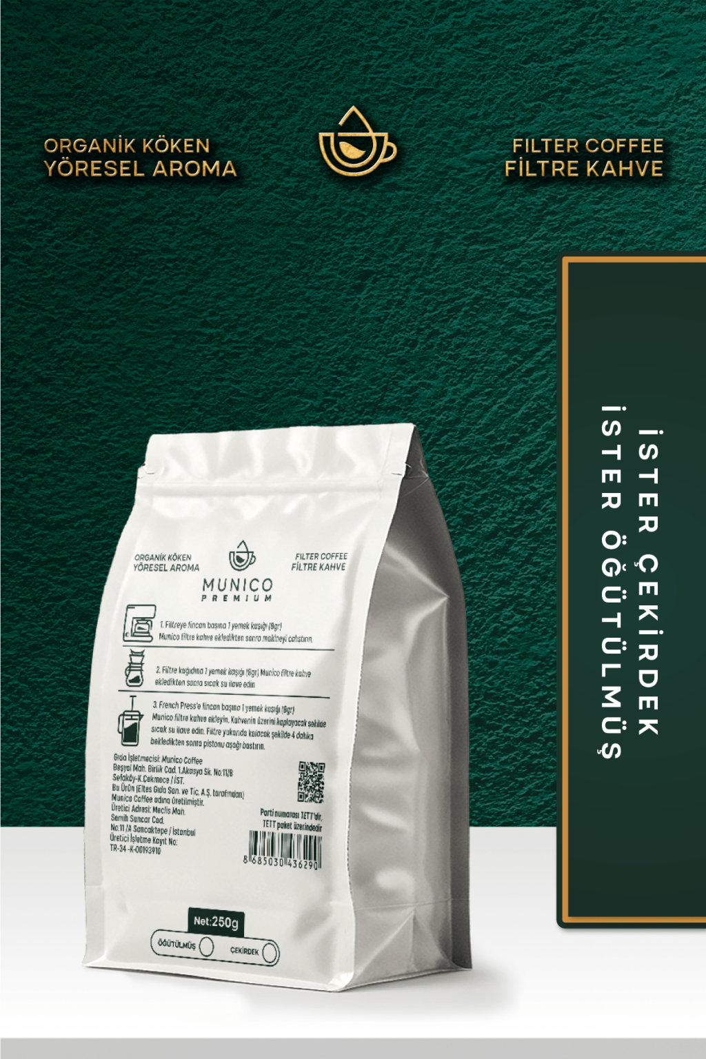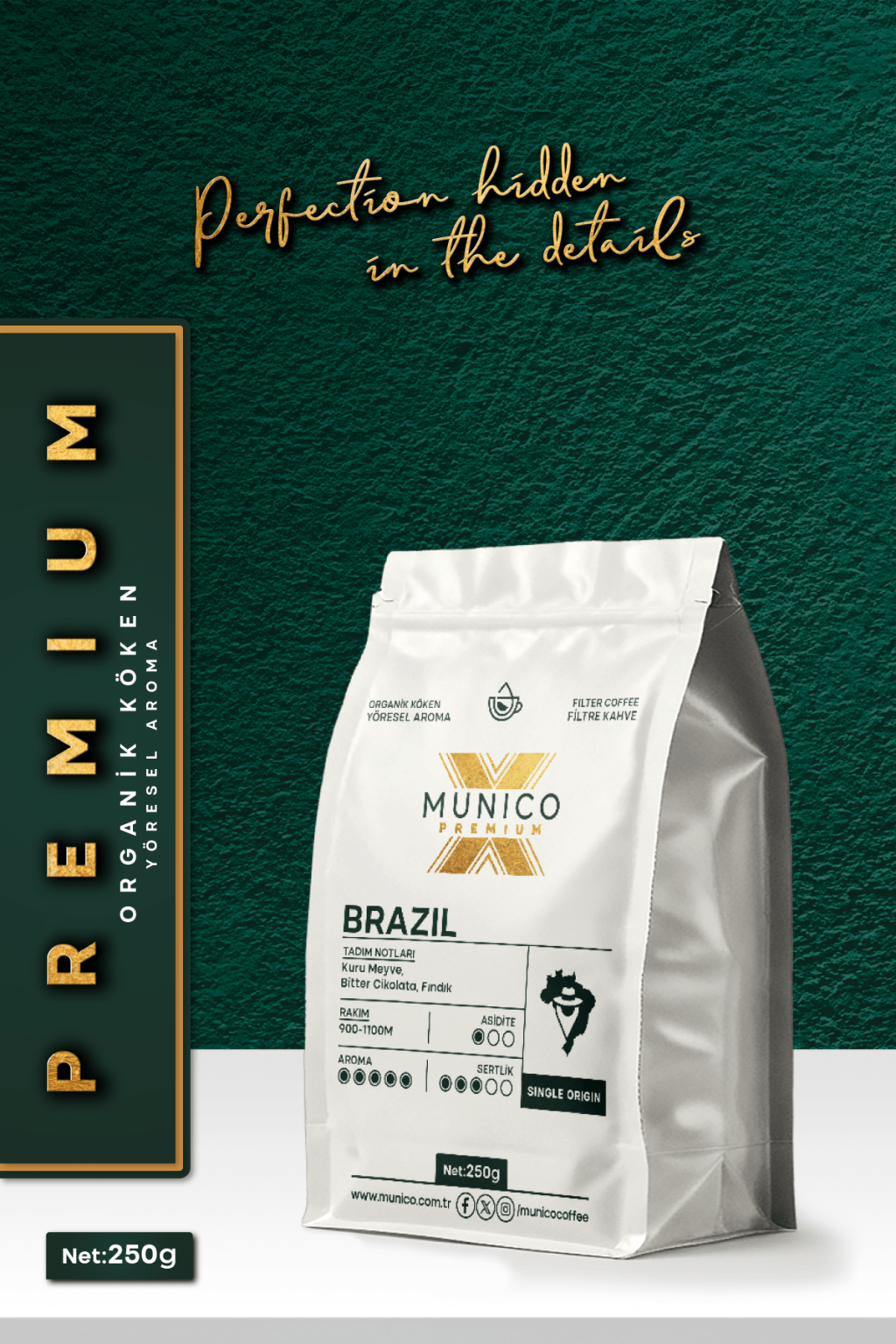 Munico Brezilya Öğütülmüş Filtre Kahve, Brezilya'nın 900-1100 metre yükseklikteki verimli topraklarından gelen seçkin çekirdeklerle hazırlanmıştır. Kuru meyve, bitter çikolata ve fındık notalarının dengeli uyumuyla klasik kahve severler için ideal bir deneyim sunar.