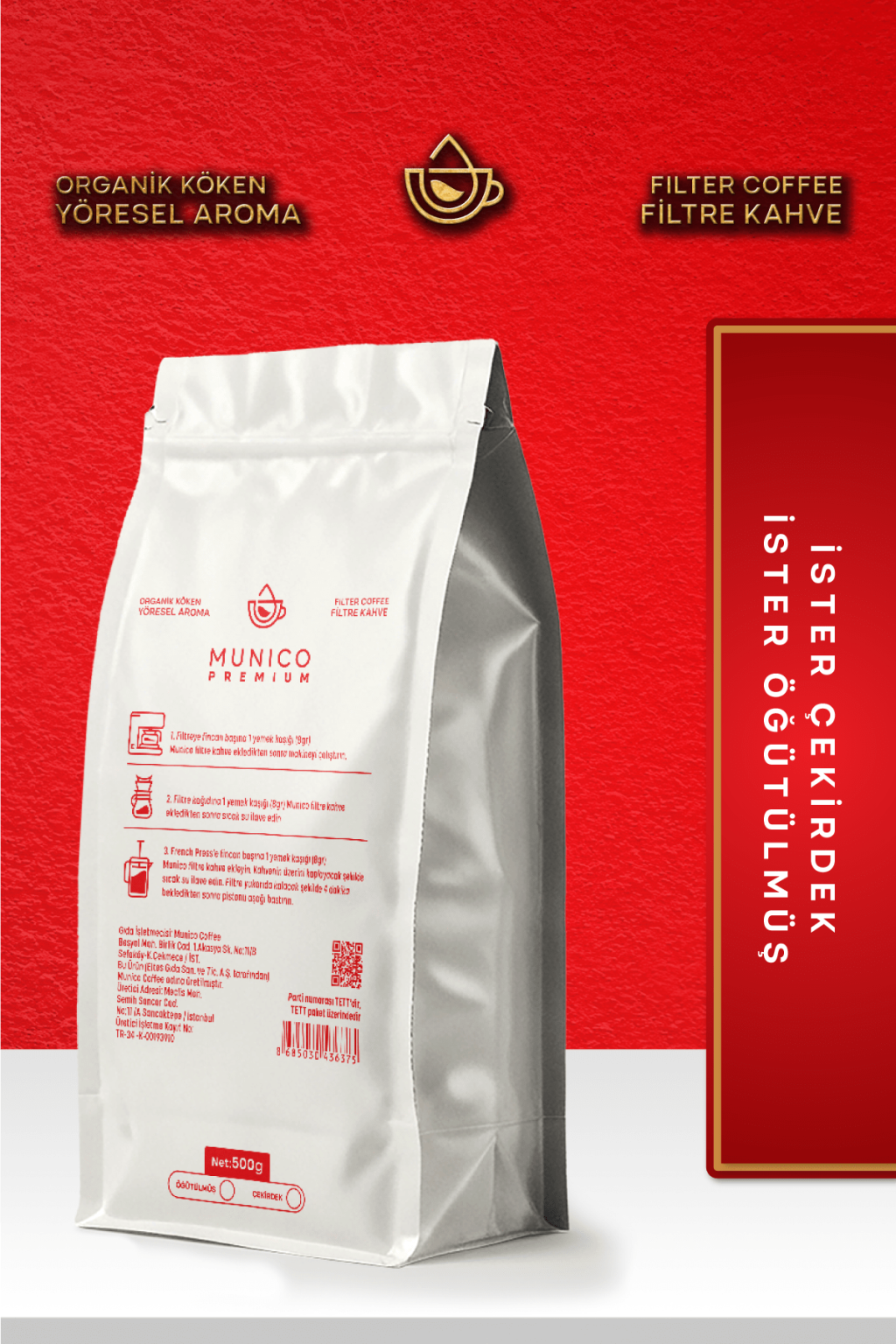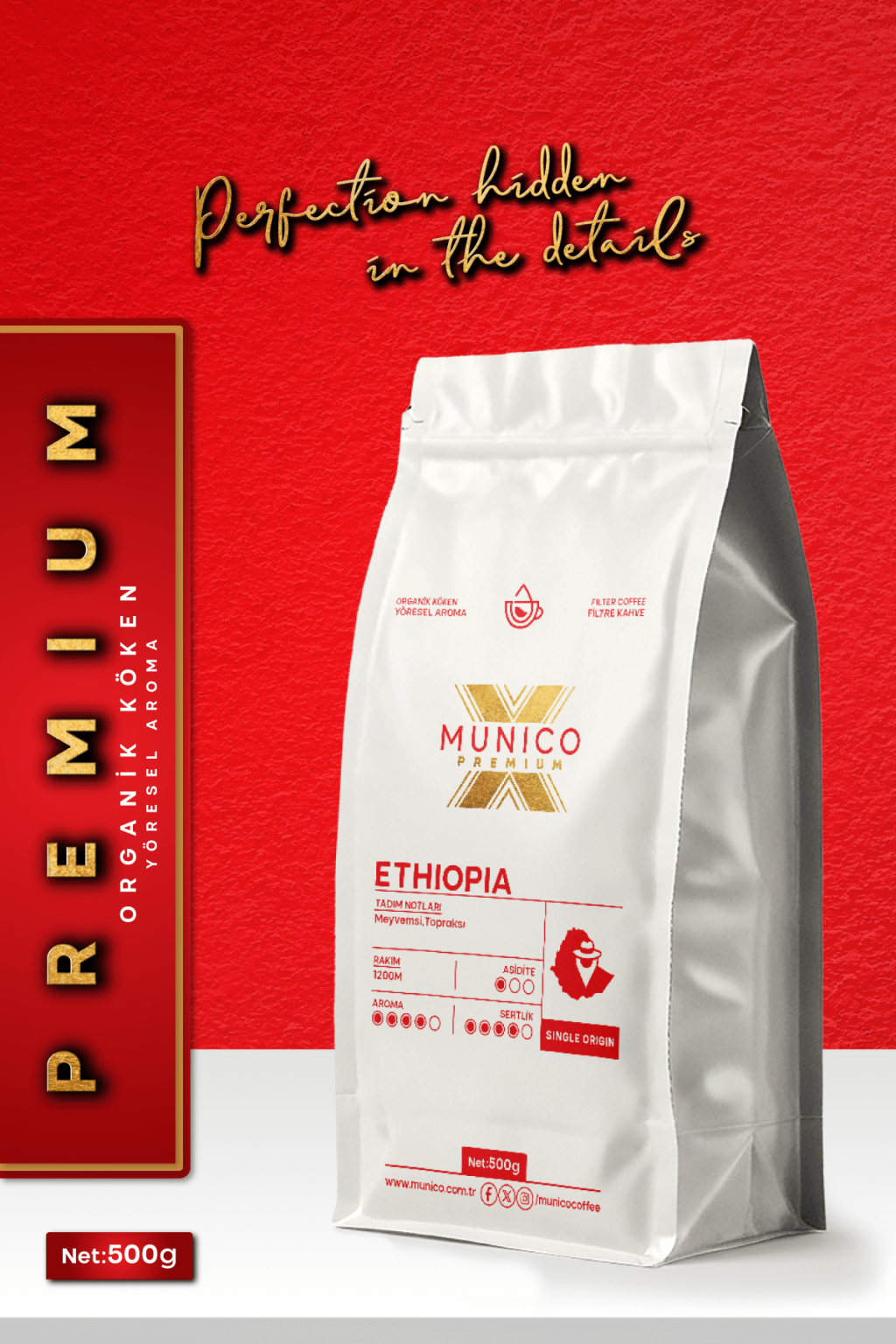 Munico Etiyopya Öğütülmüş Filtre Kahve, kahvenin keşfedildiği topraklardan, 1200 metre yükseklikte yetişen seçkin Etiyopya çekirdekleriyle hazırlanmıştır. Meyvemsi ve çiçek notalarıyla damağınızda unutulmaz bir lezzet bırakır, her fincanda kahvenin özgün karakterini yaşamanızı sağlar.